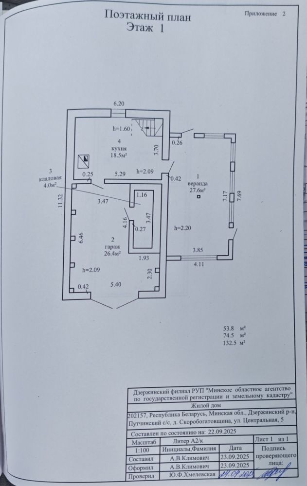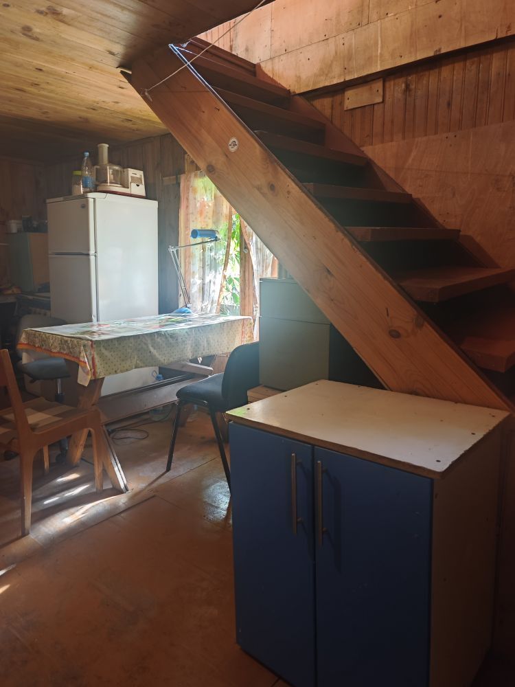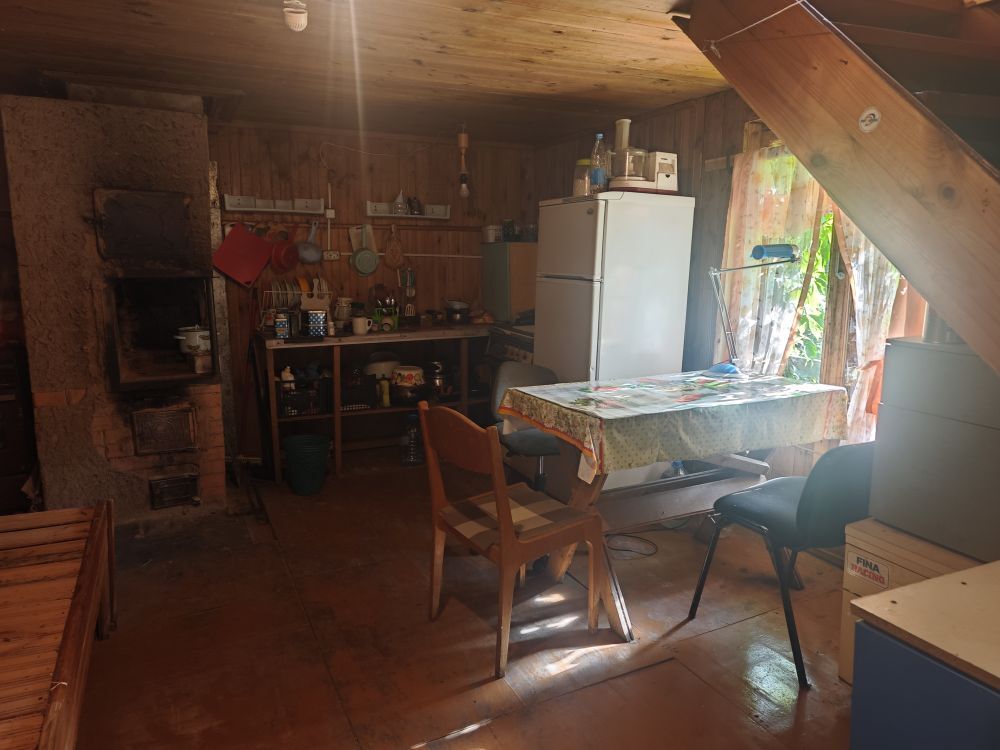 1-й уровень: гараж, веранда, кухня- гостиная, отапливается печкой, деревянная лестница на второй этаж.