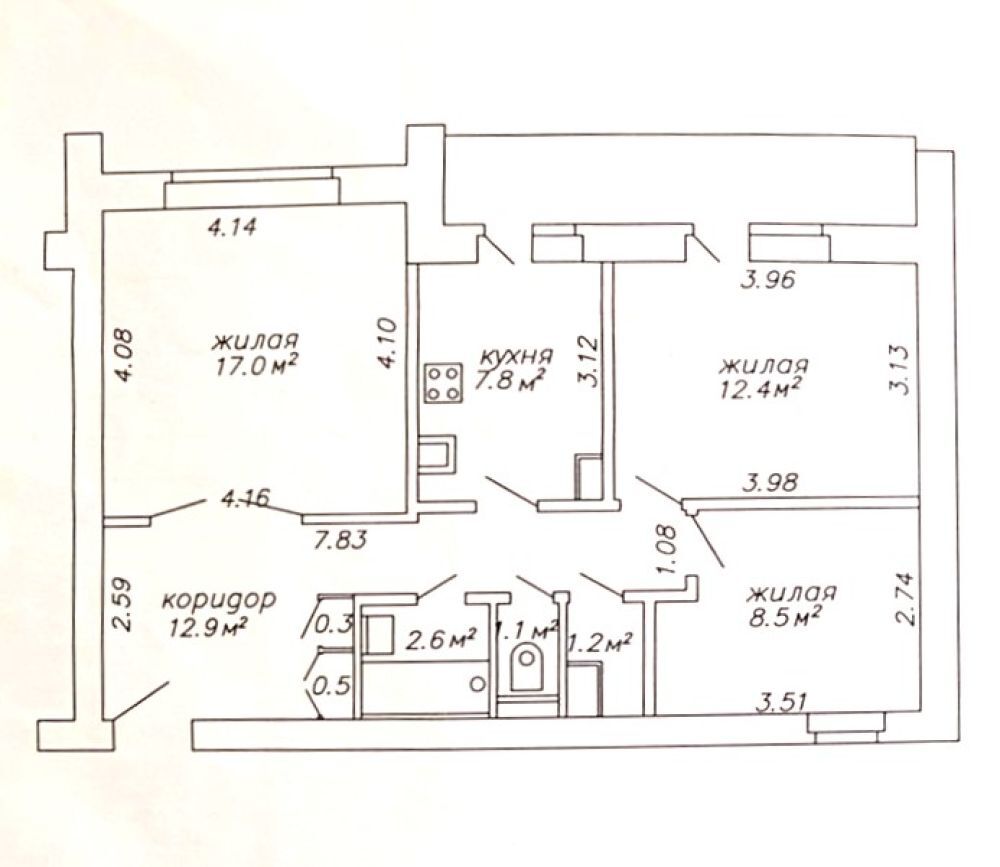 Площадь квартиры по СНБ 68 м, общая площадь 64,3м, жилая 37,9м, кухня 7,8м. Три раздельные комнаты, огромная лоджия, тамбур на 2 квартиры.