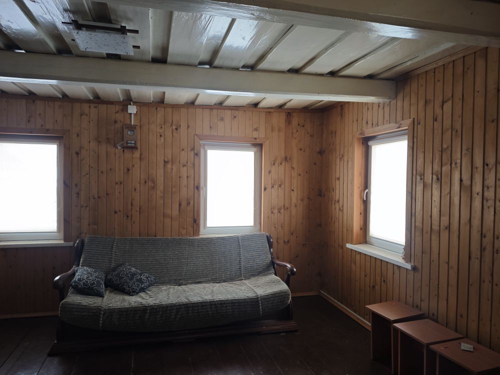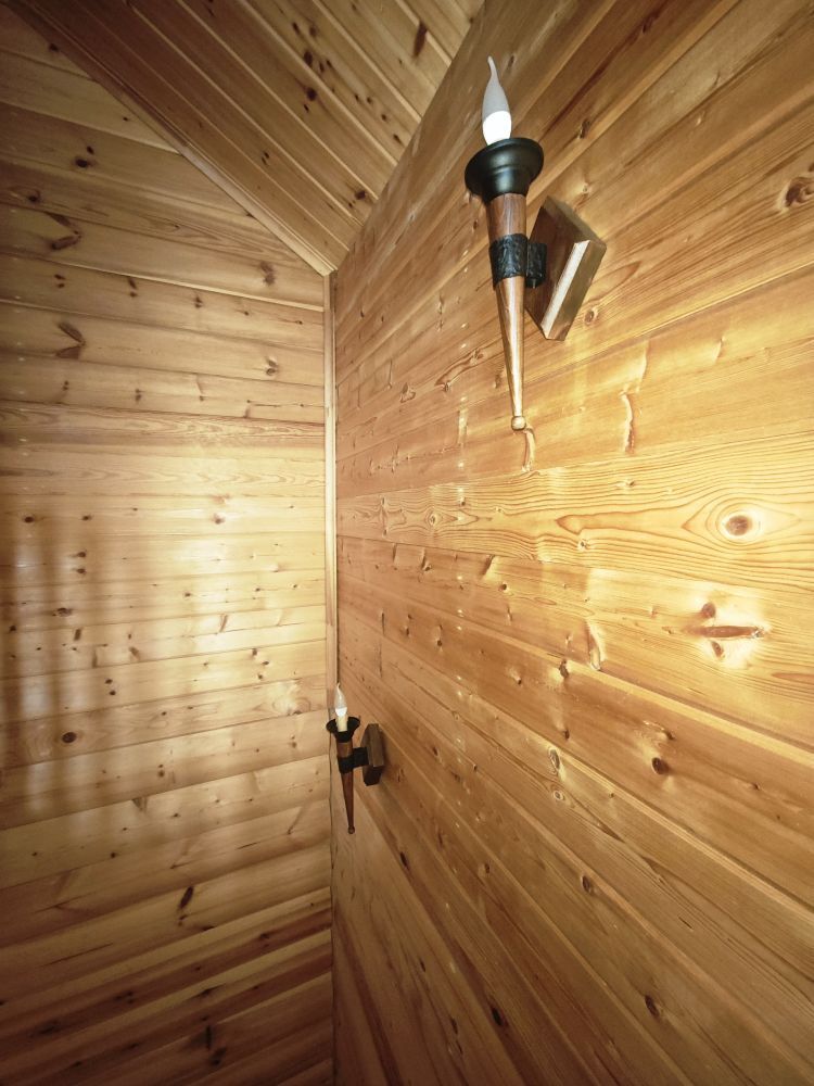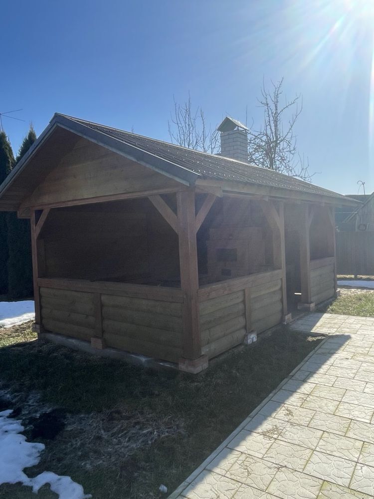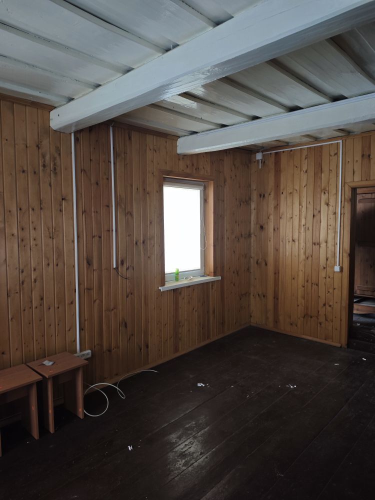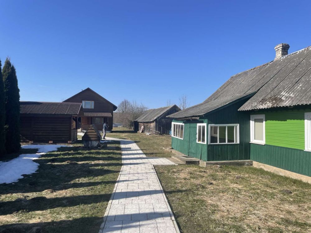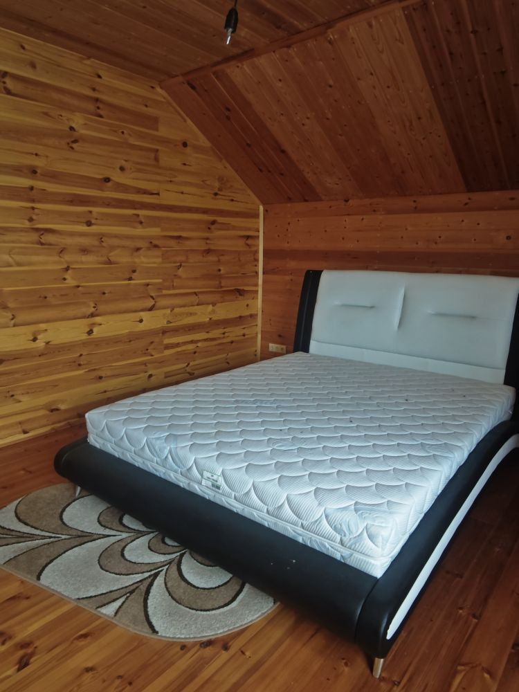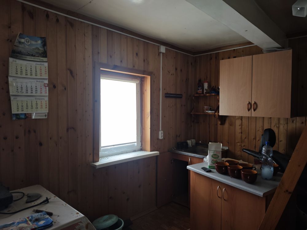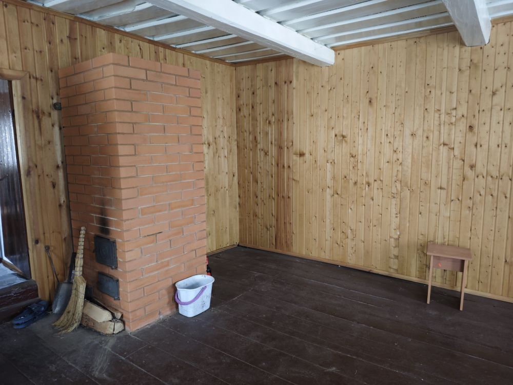 Первое строение- это отреставрированный деревянный дом с оборудованной кухней, рабочей печью, внутри отделка стен- дерево.